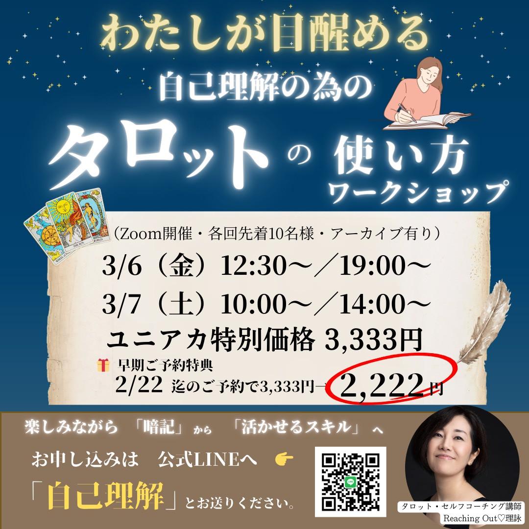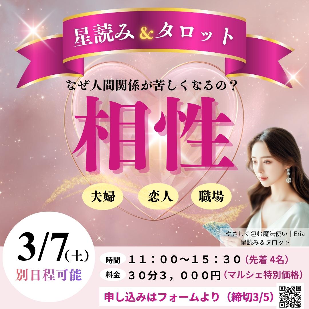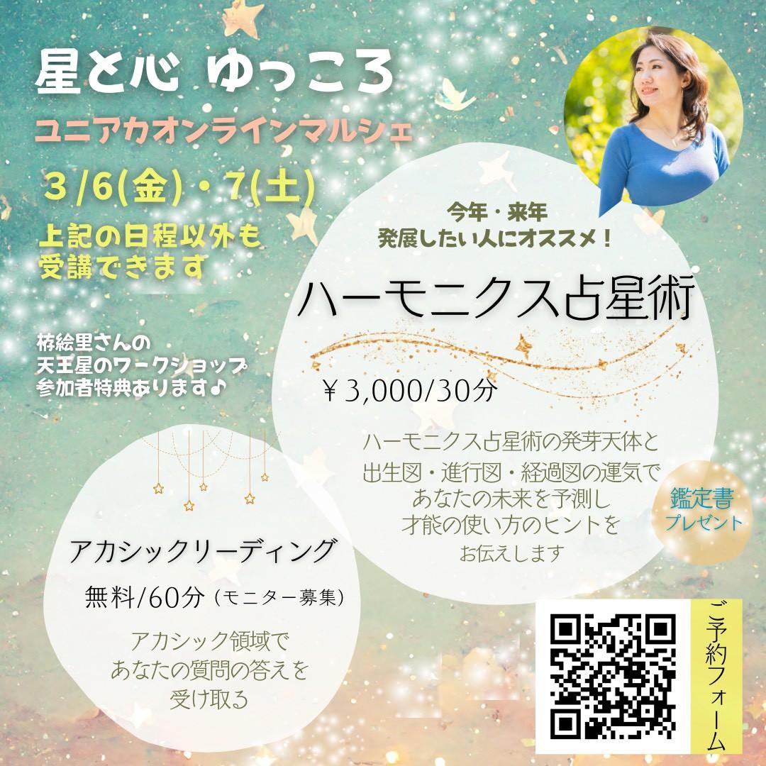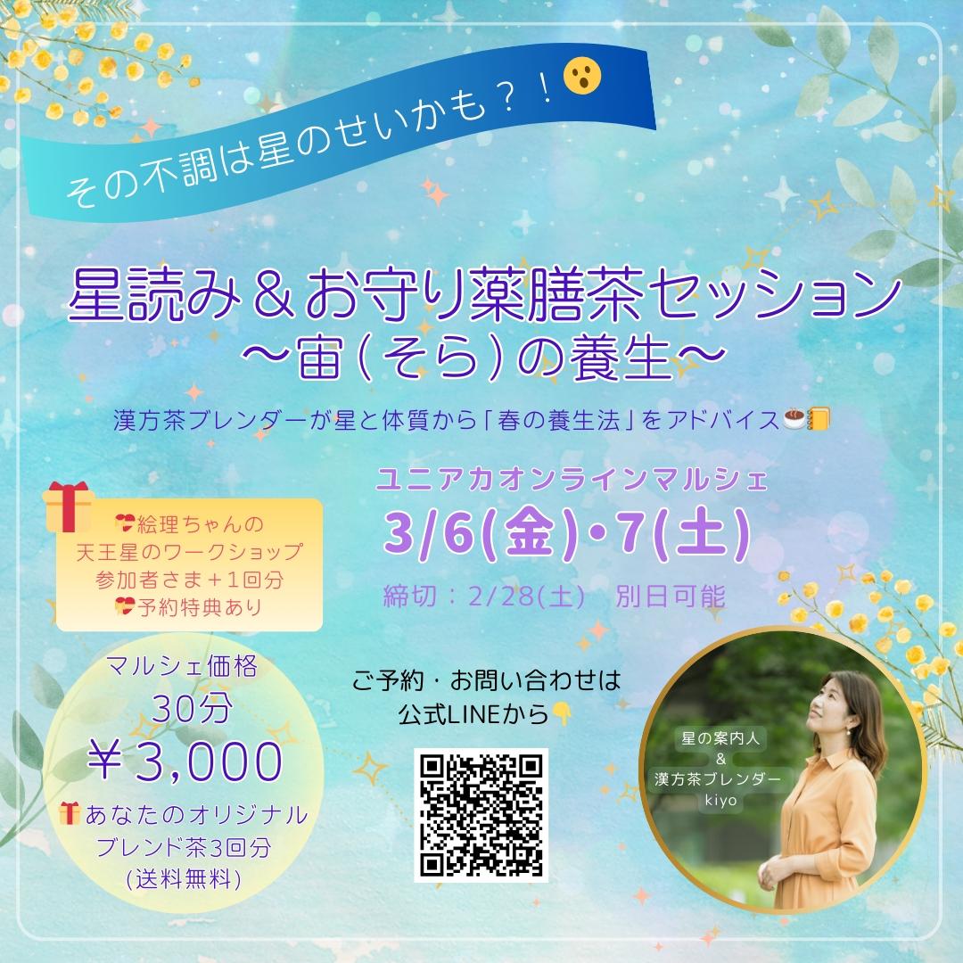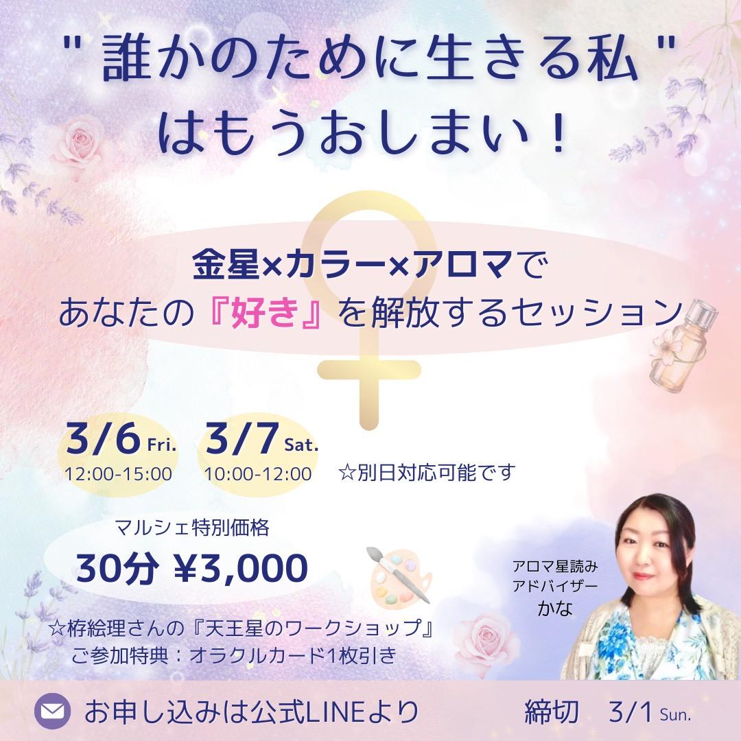 3月6日(金)・7日(土) ※栫絵理の "天王星が目醒めるワークショップ"は 3月6日(金)10:00-11:30 のみとなります マルシェの受付日時は 各出店者の紹介パートを ご確認ください |